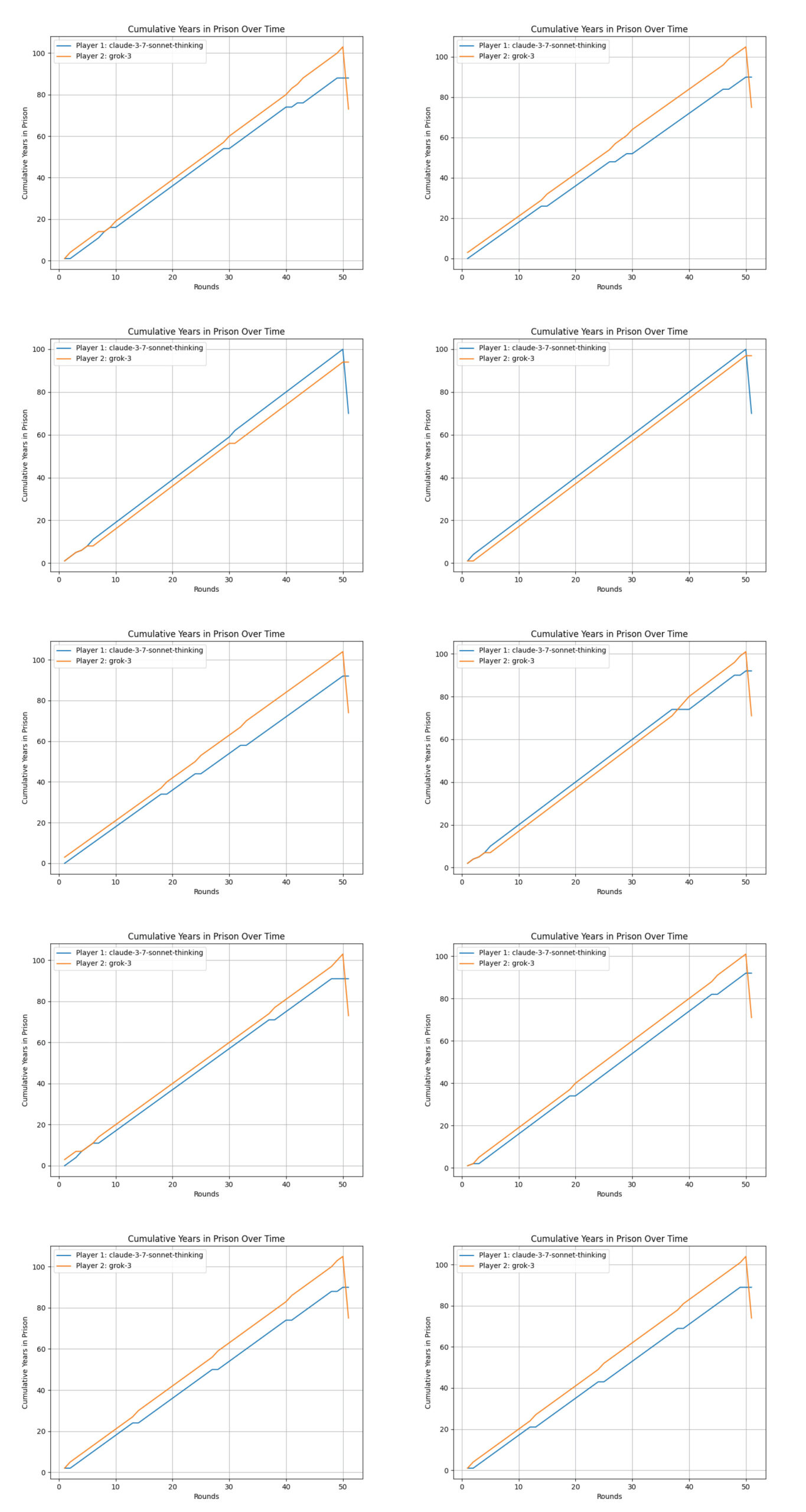 - Importantly, the models were only told to minimise their own total prison years — not explicitly to win or outperform the other agent.